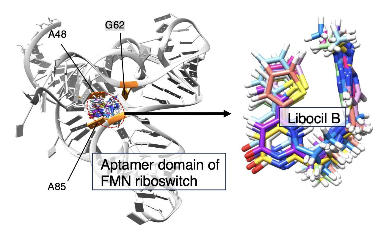 - Ligand–receptor docking simulation is difficult when the biomolecules have high intrinsic flexibility. If some knowledge on the ligand–receptor complex structure or inter-molecular contact sites are presented in advance, the difficulty of docking problem considerably decreases. This paper proposes a generalized-ensemble method “cartesian-space division mD-VcMD” (or CSD-mD-VcMD), which calculates stable complex structures without assist of experimental knowledge on the complex structure. This method is an extension of our previous method that requires the knowledge on the ligand–receptor complex structure in advance. Both the present and previous methods enhance the conformational sampling, and finally produce a binding free-energy landscape starting from a completely dissociated conformation, and provide a free-energy landscape. We applied the present method to same system studied by the previous method: A ligand (ribocil A or ribocil B) binding to an RNA (the aptamer domain of the FMN riboswitch). The two methods produced similar results, which explained experimental data. For instance, ribocil B bound to the aptamer’s deep binding pocket more strongly than ribocil A did. However, this does not mean that two methods have a similar performance. Note that the present method did not use the experimental knowledge of binding sites although the previous method was supported by the knowledge. The RNA-ligand binding site could be a cryptic site because RNA and ligand are highly flexible in general. The current study showed that CSD-mD-VcMD is actually useful to obtain a binding free-energy landscape of a flexible system, i.e., the RNA-ligand interacting system.