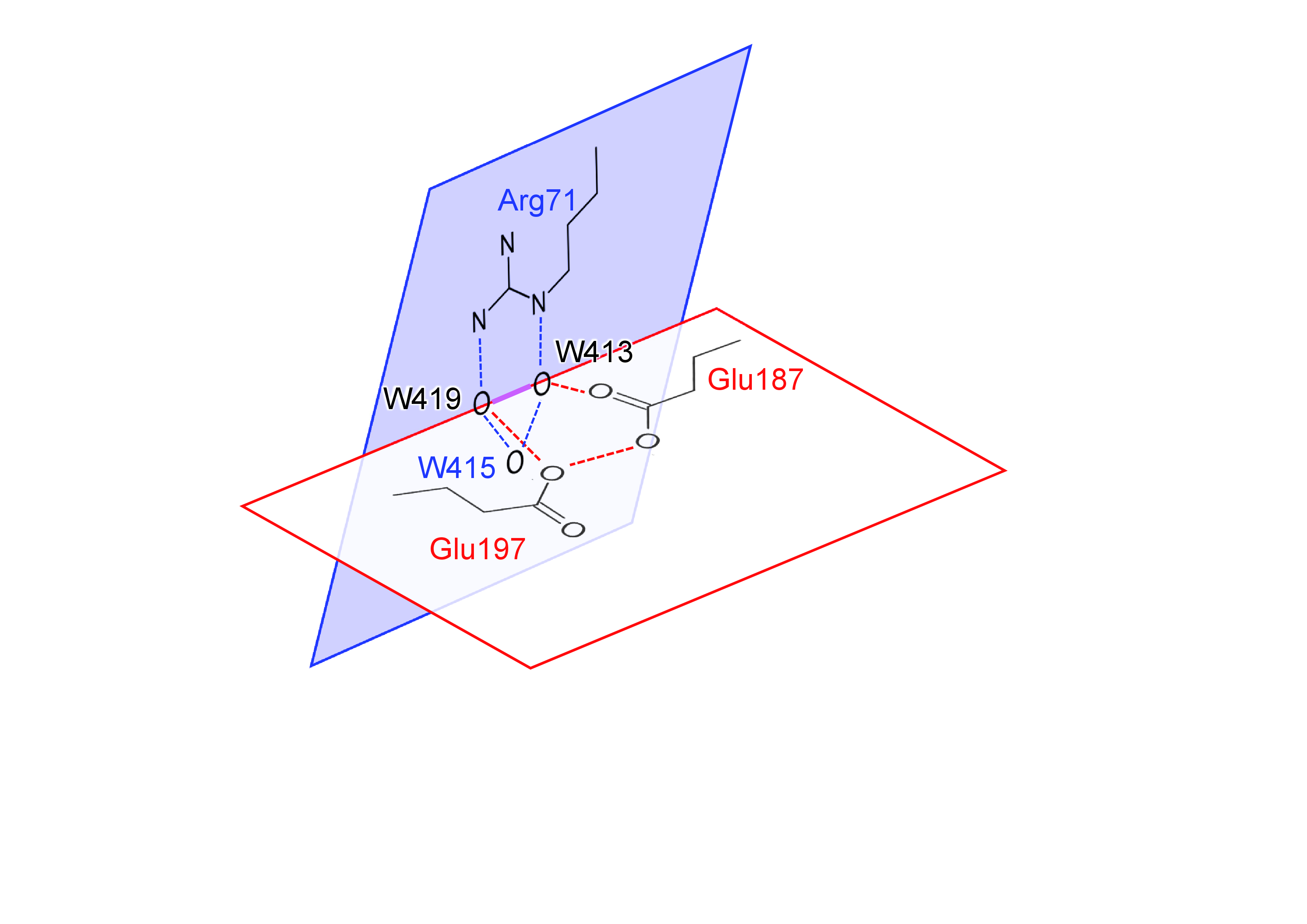 - The crystal structure of Rubrobacter xylanophilus rhodopsin (RxR) reveals a triangular cluster of three water molecules (W413, W415, and W419) at the extracellular proton-release site, near Glu187 and Glu197. Using a quantum mechanical/molecular mechanical approach, we identified the structural nature of this unique water cluster. The triangular shape is best reproduced when all three water molecules are neutral H2O with protonated Glu187 and deprotonated Glu197. Attempts to place H3O+ at any of these water molecules result in spontaneous proton transfer to one of the acidic residues and significant distortion from the crystal structure. The plane defined by the triangular water cluster extends into the guanidinium plane of Arg71, with both aligned along the W413...W419 axis. This extended plane lies nearly perpendicular to a five-membered, ring-like H-bond network involving two carboxyl oxygen atoms from Glu187 and one from Glu197. The resulting bipartite planar architecture, defined by the water triangle, Arg71, and the Glu187/Glu197 network may reflect the exceptional thermal stability in RxR.