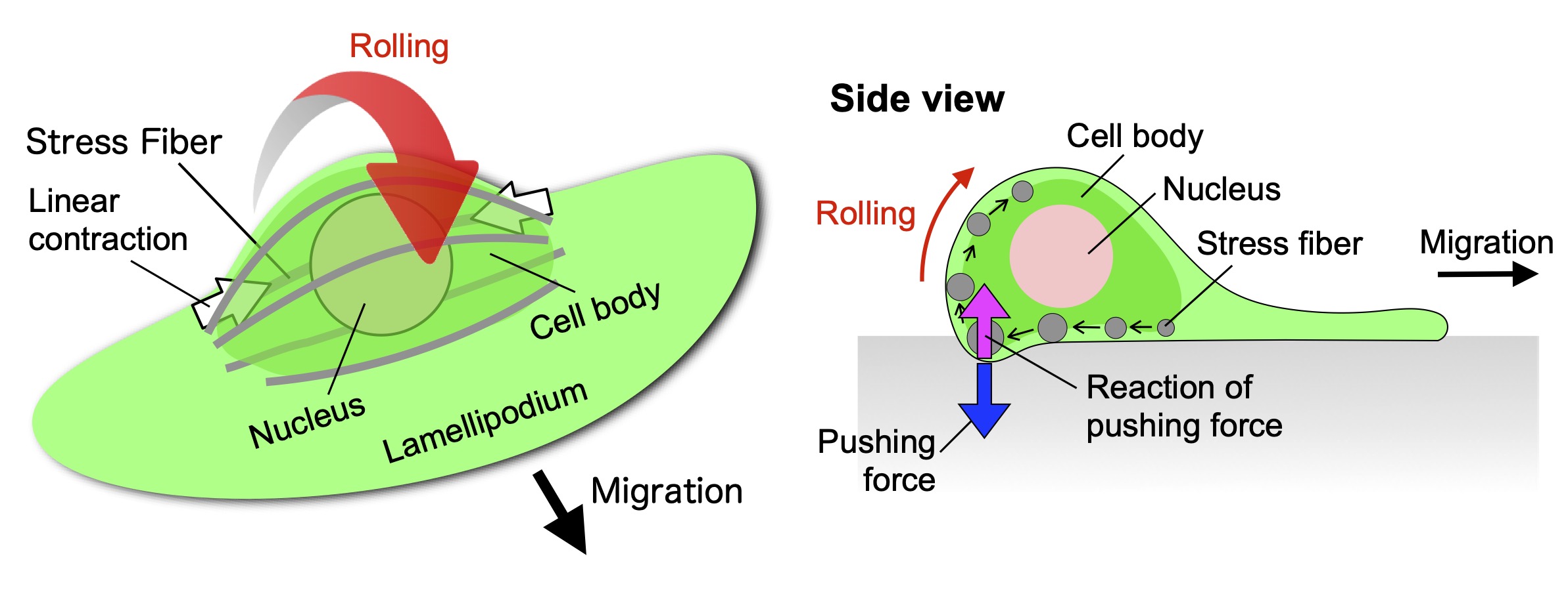 - Single epidermal keratocytes, which are responsible for wound repair in fish, migrate while maintaining their characteristic shape: a frontal crescent-shaped lamellipodium and a posterior rugby-ball-shaped cell body. These cells are widely used in cell migration studies, especially to examine the role of actin polymerization at the leading edge of the cell. In the posterior part of the cell, stress fibers, which are bundles of actomyosin, are aligned along the seam of the ‘rugby ball.’ The ball rotates with the stress fibers during migration. The linear contraction of stress fibers appears to drive the rotation of the cell body. This review describes a conversion mechanism from linear motion to rotation driven by stress fiber contraction and soft cell body deformation, which is not found in man-made machines. We also describe a unique research method that is able to demonstrate this machinery by creating robot models. Due to their high migration rate and ease of culturing, fish keratocytes appear to be one of the best materials for studying both single cell and collective cell migration. In this review, we will also give some recent research examples of collective migration using keratocytes.