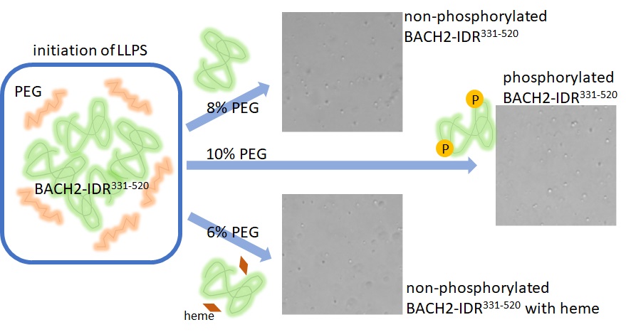 - Intrinsically disordered regions (IDRs) are vital for several cellular processes. They play a significant role in liquid-liquid phase separation (LLPS). LLPS enhances reaction efficiency by locally concentrating proteins and nucleic acids. The BACH2 transcription factor contains such IDRs. Early observations hinted at the phase separation capabilities of BACH2. However, how BACH2-IDR directly participates in LLPS is not fully understood. Its precise modulation by heme binding and phosphorylation also requires further elucidation. This study experimentally demonstrated the intrinsic capability of BACH2-IDR (residues 331-520) to undergo LLPS in vitro. Microscopic observations revealed that TANK-binding kinase 1(TBK1)-mediated phosphorylation suppressed LLPS of BACH2-IDR. Conversely, the coexistence of heme enhanced LLPS, initiating LLPS at lower polyethylene glycol concentrations. Bioinformatic analyses supported these experimental observations. Tools such as FuzDrop and CIDER were used to predict LLPS propensity from sequences. Specifically, the calculations for the sequence of phosphorylation-mimic mutations showed changes in LLPS-promoting regions. Heme binding influenced TBK1-mediated phosphorylation sites. Some of these sites overlap with predicted LLPS-driving regions. Heme binding also induced substantial conformational alterations within BACH2-IDR. Consequently, we propose LLPS as a fundamental regulatory mechanism for BACH2 protein function. This process complements its known regulation through heme binding and phosphorylation.
