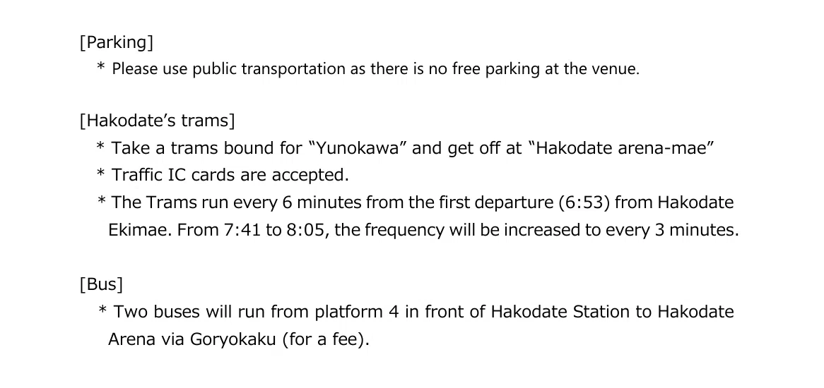 - ・Please use public transportation (bus, train, etc.) to get to the venue from your accommodation (Hakodate Station, Goryokaku, Yunokawa, etc.).