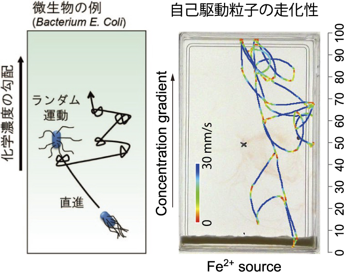 環境の勾配に応答して適切な条件の領域に集まる機能は走性と呼ばれる.本稿では,質点と見なせるほど小さな大腸菌が実現する走化性の戦略を,水面滑走する自己駆動粒子で再現した実験,その仕組みを説明する簡単なランダムウォークモデルを用いた数値計算,そして実験結果と数値計算結果の整合性について紹介する.
