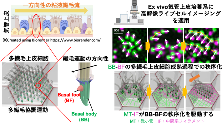 我々は,多繊毛上皮細胞における繊毛協調運動の基盤となる基底小体(BB)と基底足(BF)の秩序化過程を遺伝子改変蛍光標識マウスと高解像ライブイメージングで可視化し,細胞の分化段階に応じてアピカル細胞骨格である微小管と中間径フィラメントがBB-BFの配列・配向の秩序化の確立に寄与することを明らかにした.