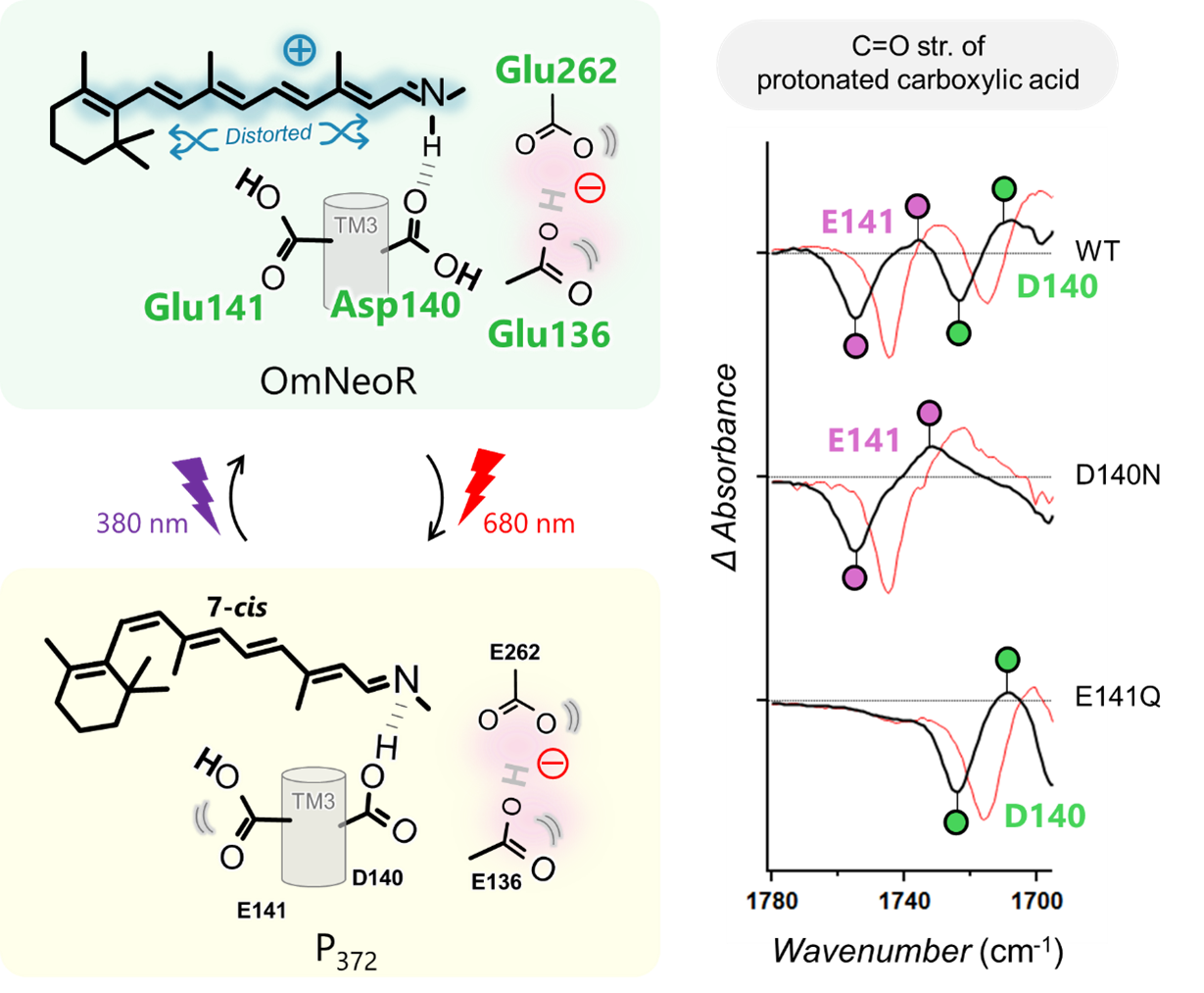 - Neorhodopsin (NeoR), an enzymerhodopsin, has unique molecular properties. NeoR absorbs near-infrared light whose λmax is located at 690-700 nm. Upon light absorption, NeoR is photoisomerized into the 7-cis form with low quantum yield. Unique color-tuning and photoreaction mechanism of NeoR is owing to the residues surrounding the all-trans retinal chromophore. In NeoR, three carboxylates, E136, D140, and E262, constitute a counterion triad near the retinal Schiff base, and E141 is located near the β-ionone ring. Despite recent experimental and theoretical studies, protonation states of the highly conserved four carboxylates have never been experimentally determined. In this study, we performed comprehensive mutation analysis of NeoR by UV-visible and FTIR spectroscopy. We prepared E136Q, D140N, E141Q, and E262Q mutants of an NeoR. Among four mutants, only E262Q did not form a pigment, suggesting that E262 is the principal Schiff base counterion. Light-induced FTIR spectroscopy detected two bands of protonated carboxylic acids, and vibrational bands were identified as protonated D140 and E141. Hydrogen bond of D140 is strong in NeoR, which is further strengthened upon photoisomerization into the 7-cis form. The Schiff base is the possible hydrogen-bonding partner of D140. Hydrogen bond of E141 is very weak in NeoR, but E141 newly forms a hydrogen bond upon 7-cis isomerization. Protonation states of E136 and E262 were not determined conclusively, whereas the present FTIR study suggests that one negative charge is delocalized at E136 and E262 that contributes to unusual spectral red-shift in NeoR. Four carboxylates near the retinal chromophore in NeoR play their own roles in unique color-tuning and photoreaction mechanism.