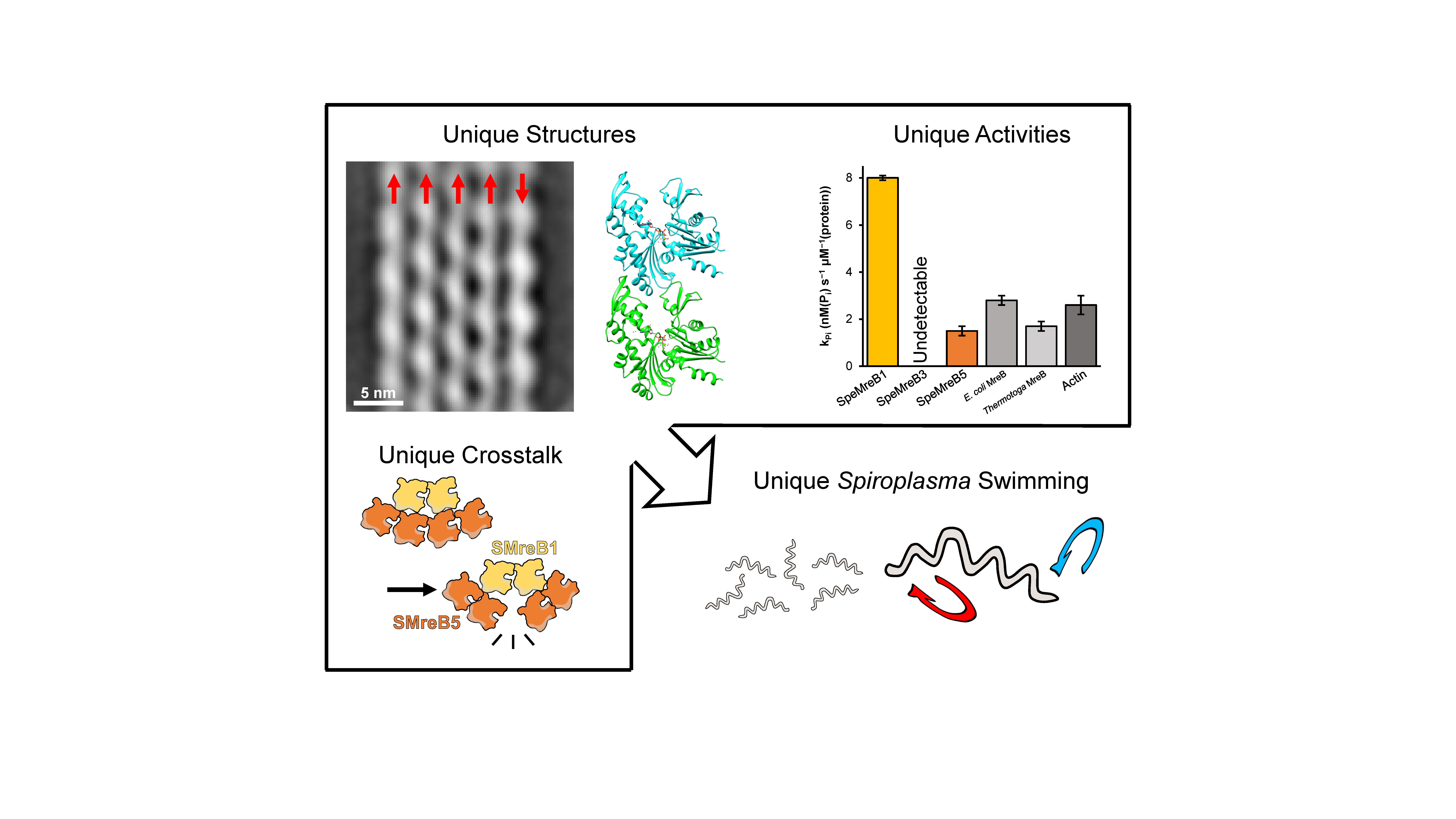 - The cytoskeleton, comprising intracellular filamentous structures composed of polymerized proteins, is crucial for the survival of both eukaryotes and prokaryotes. Although bacterial cytoskeletal proteins have diverged, they generally do not drive cellular motility. Spiroplasma, a genus of wall-less helical bacteria, swims by propagating a helicity-switching point (kink) along its cell axis. Unlike typical walled bacteria, whose motility depends on widespread motility machineries such as flagella and pili, Spiroplasma swimming is powered by the coordinated dynamics of five isoforms of bacterial actin MreB (SMreB1–5), which are grouped into three phylogenetic classes: SMreB1 and 4, SMreB2 and 5, and SMreB3. Despite the efforts to understand Spiroplasma swimming, its molecular mechanism remains unclear. In this review, we summarize how in vitro analyses of SMreBs have provided mechanistic insights into Spiroplasma swimming. While all SMreBs conserve the canonical actin fold, each SMreB class exhibits unique characteristics in its polymerized structures, ATPase activities, polymerization dynamics, and membrane binding. Studies of an essential SMreB subset for Spiroplasma swimming, i.e. SMreB1 and SMreB5, have revealed that SMreB1 binds to polymerized SMreB5 and disassembles it depending on the nucleotide state. These results challenge the previous model in which Spiroplasma swimming is driven by the coordinated extension and contraction of two distinct SMreB filaments. Finally, we discuss potential molecular mechanisms underlying Spiroplasma swimming and highlight key questions that must be answered to validate these models.
