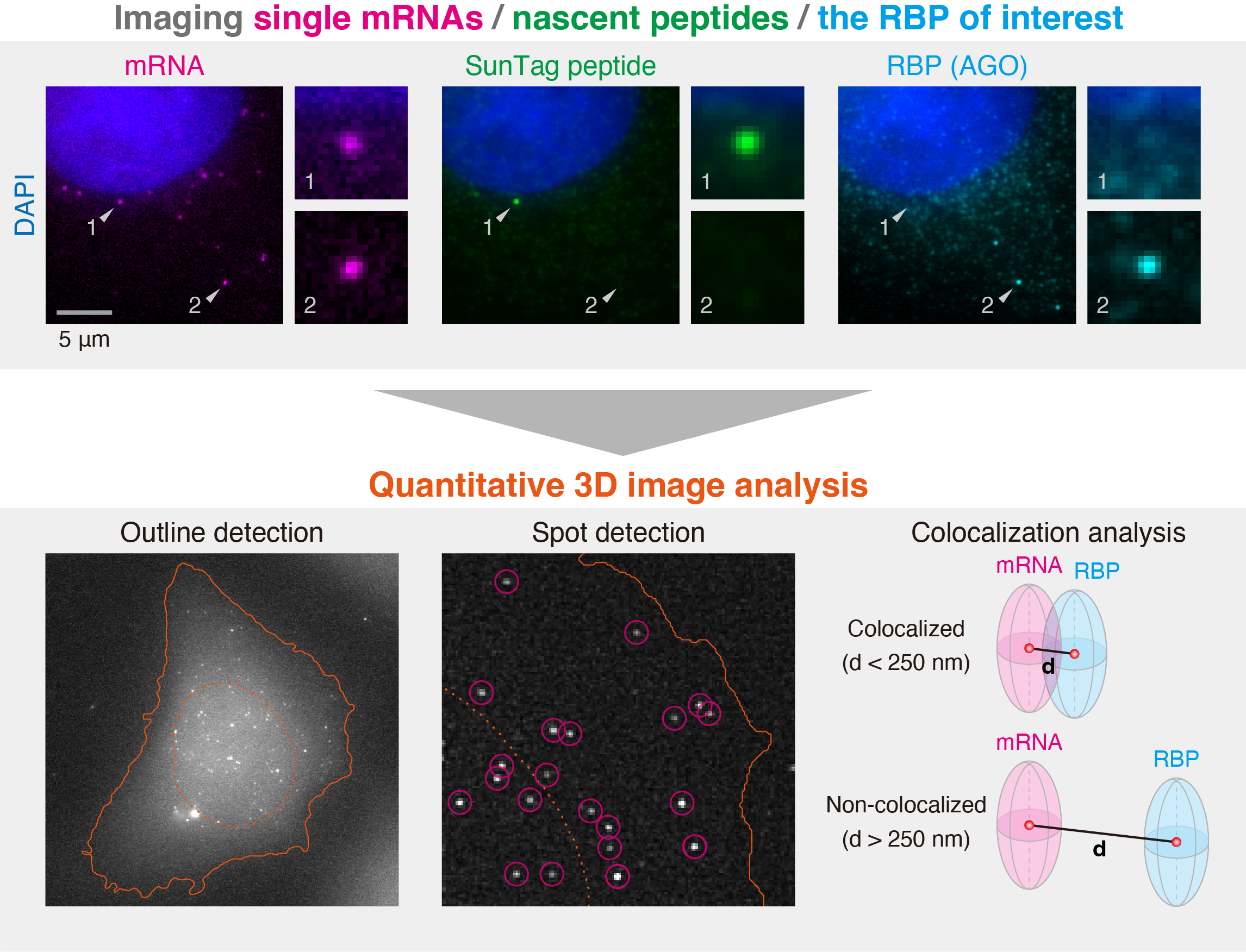 - Translation – the process by which mRNAs are decoded into nascent peptides – is fundamental to life. This process is regulated by various RNA-binding proteins (RBPs), which interact with their target mRNAs. While traditional biochemical approaches have provided valuable insights into translational control, they rely on ensemble measurements of bulk mRNAs in test tubes. Consequently, the behavior of individual mRNAs and their spatiotemporal dynamics in cells during translational control remain largely unexplored. Offering a way to address such limitations, we developed a method for imaging translational control by Argonaute (AGO) proteins, a class of RBPs, at single-mRNA resolution in cells. This method, which employs three-color fluorescence microscopy to detect mRNAs, nascent peptides, and AGO, can also serve as a versatile platform for analyzing translational control by other RBPs. In this protocol, we provide a step-by-step guide for implementing this method to facilitate spatiotemporal studies of translational control at the single-cell and single-mRNA levels.